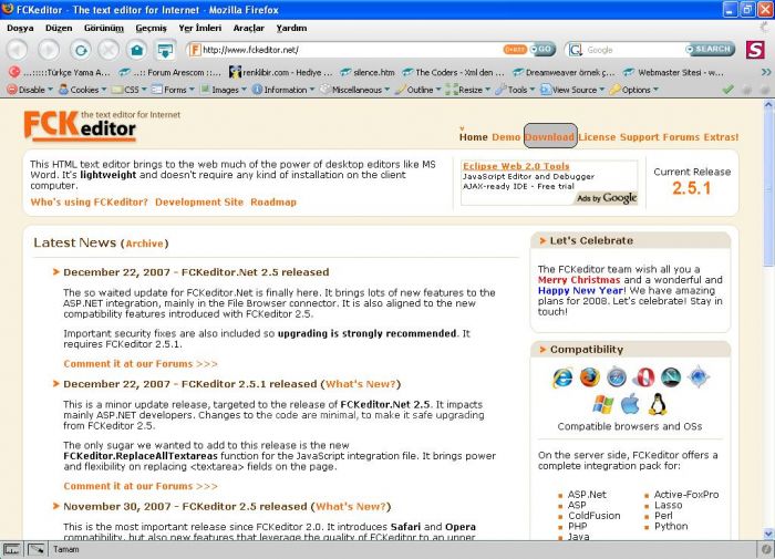 İlk olarak Fck Editör isimli eklentinin resmi sitesi olan ‘http://www.fckeditor.net/’ adresli siteye giriyoruz. Daha sonra site açıldığında aşağıdaki pencere karşımıza geliyor: